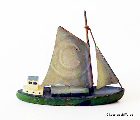 Motorfrachtsegler, hellgrüner Rumpf. |